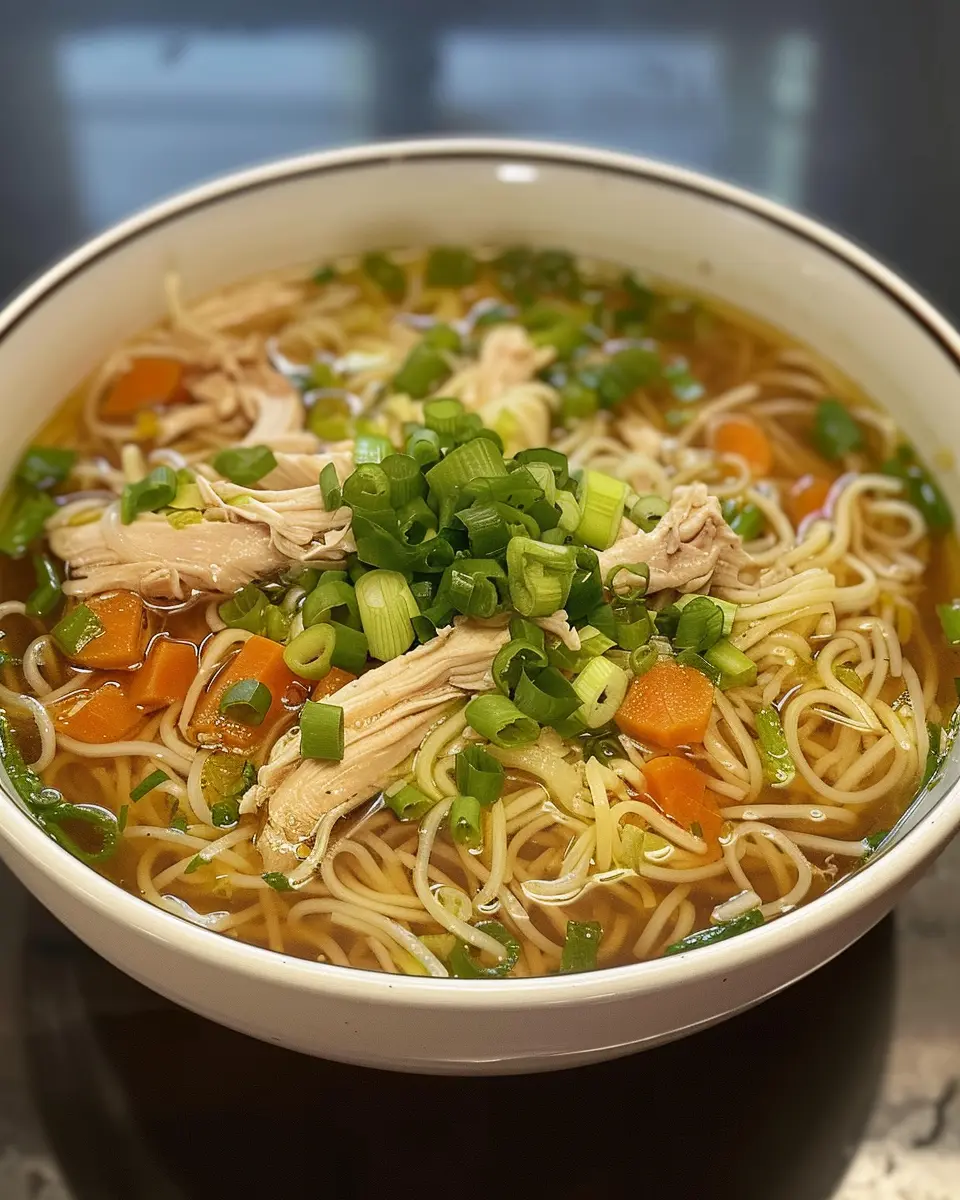 Aromatic Ginger Scallion Chicken Noodle Soup is the perfect dish for warm, cozy nights, combining the rich flavors of ginger and scallions with tender chicken and noodles.