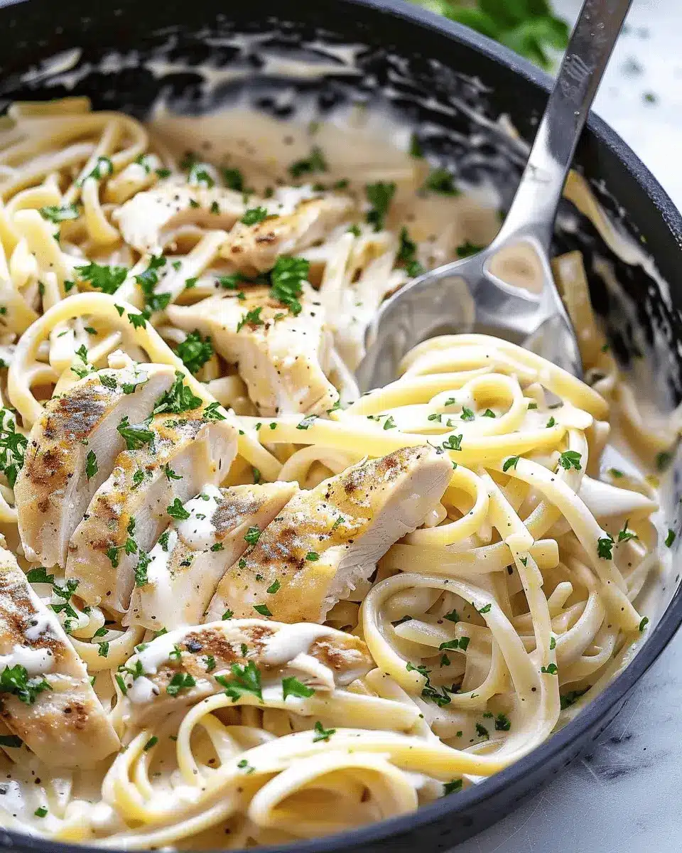 Don’t feel limited to chicken! If you’re in the mood for a seafood twist or looking for lower-fat options, try substituting with shrimp or even turkey bacon. Shrimp cooks quickly and adds a delightful, ocean-fresh flavor to your pasta. You can sautĆ© them with garlic and butter before combining them with the alfredo sauceāheavenly!