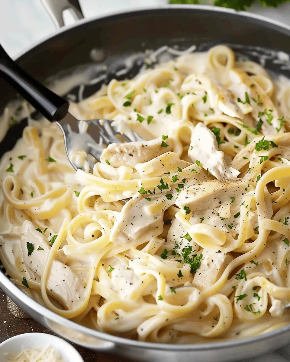 Finally, the moment youāve been waiting forāserving your best creamy chicken Alfredo pasta!