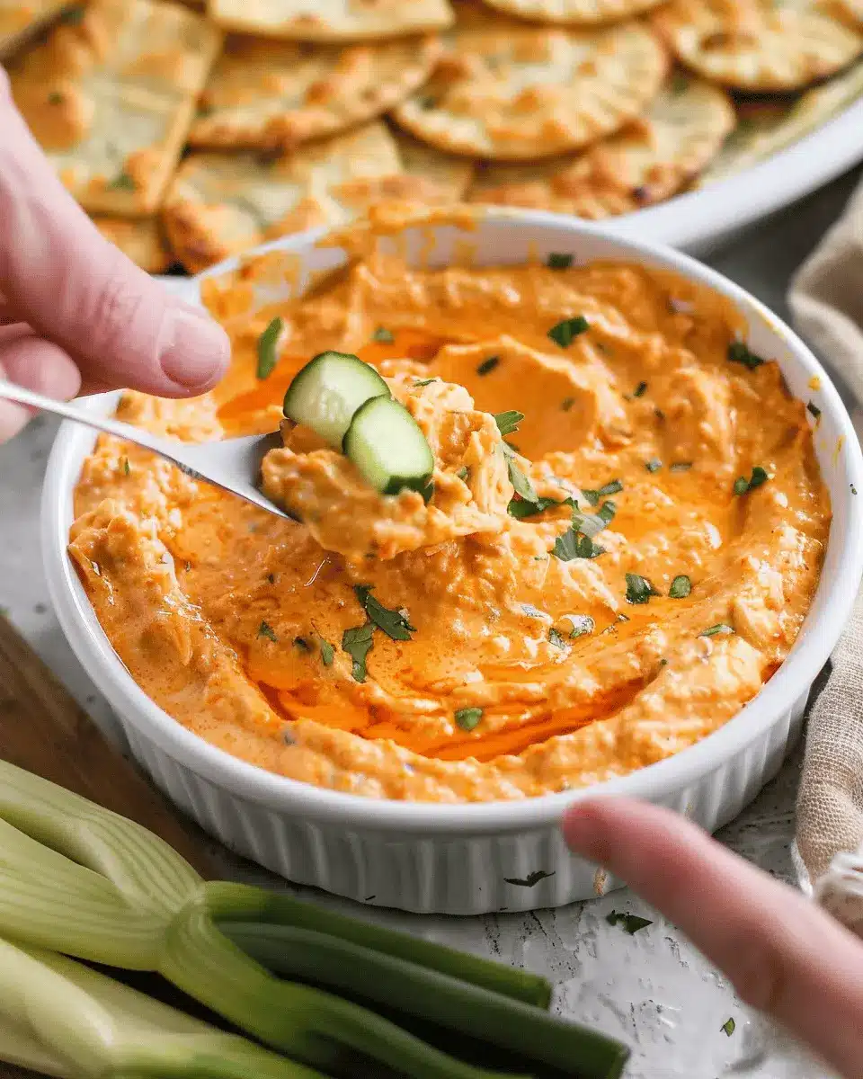 Versatile Pairings: Buffalo Chicken Dip can be enjoyed with a variety of dippers—from crispy tortilla chips and crunchy celery sticks to soft pretzel bites and pita bread. This versatility allows guests to customize their experience.