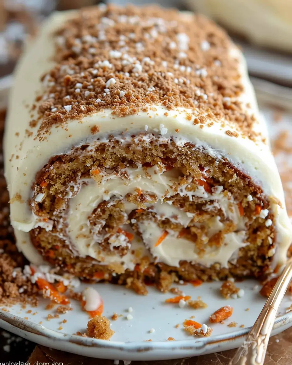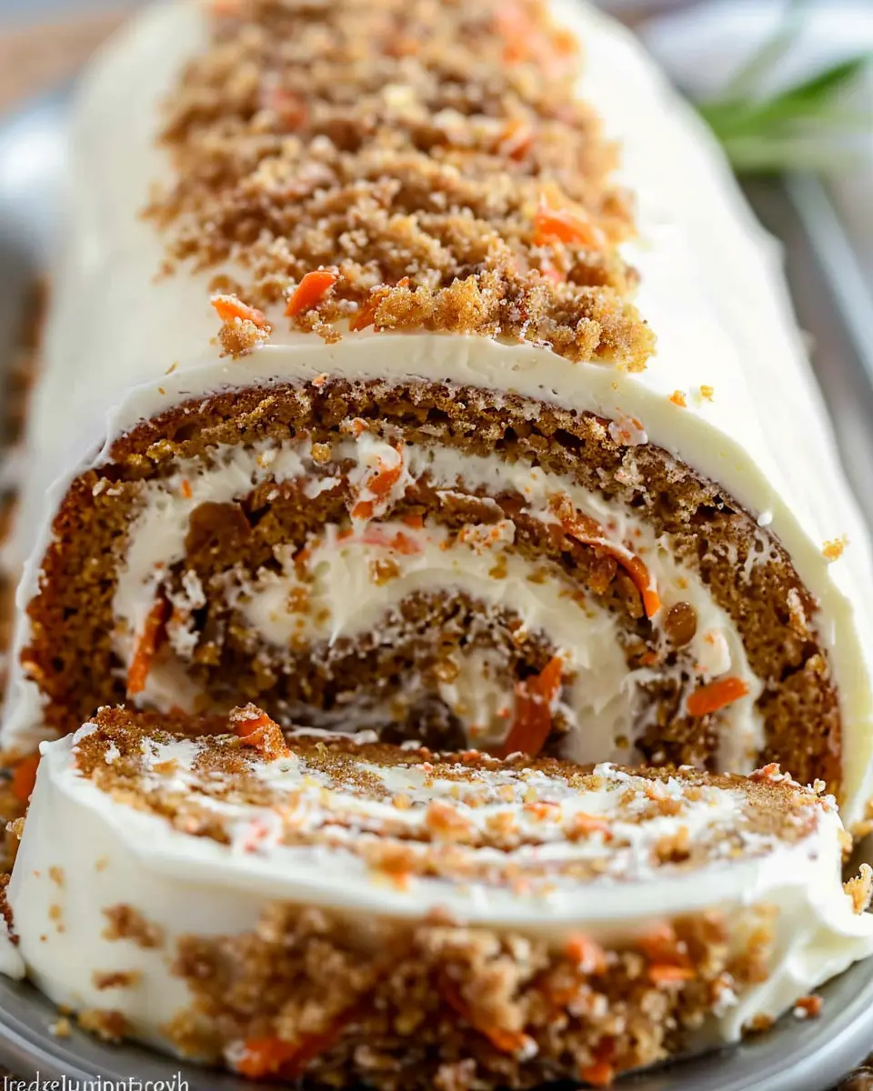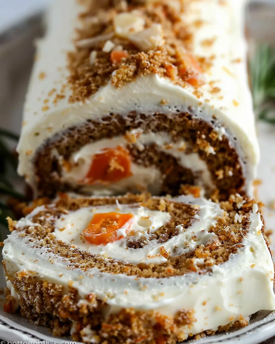 A delicious and moist carrot cake roll filled with cream cheese frosting, perfect for any occasion.