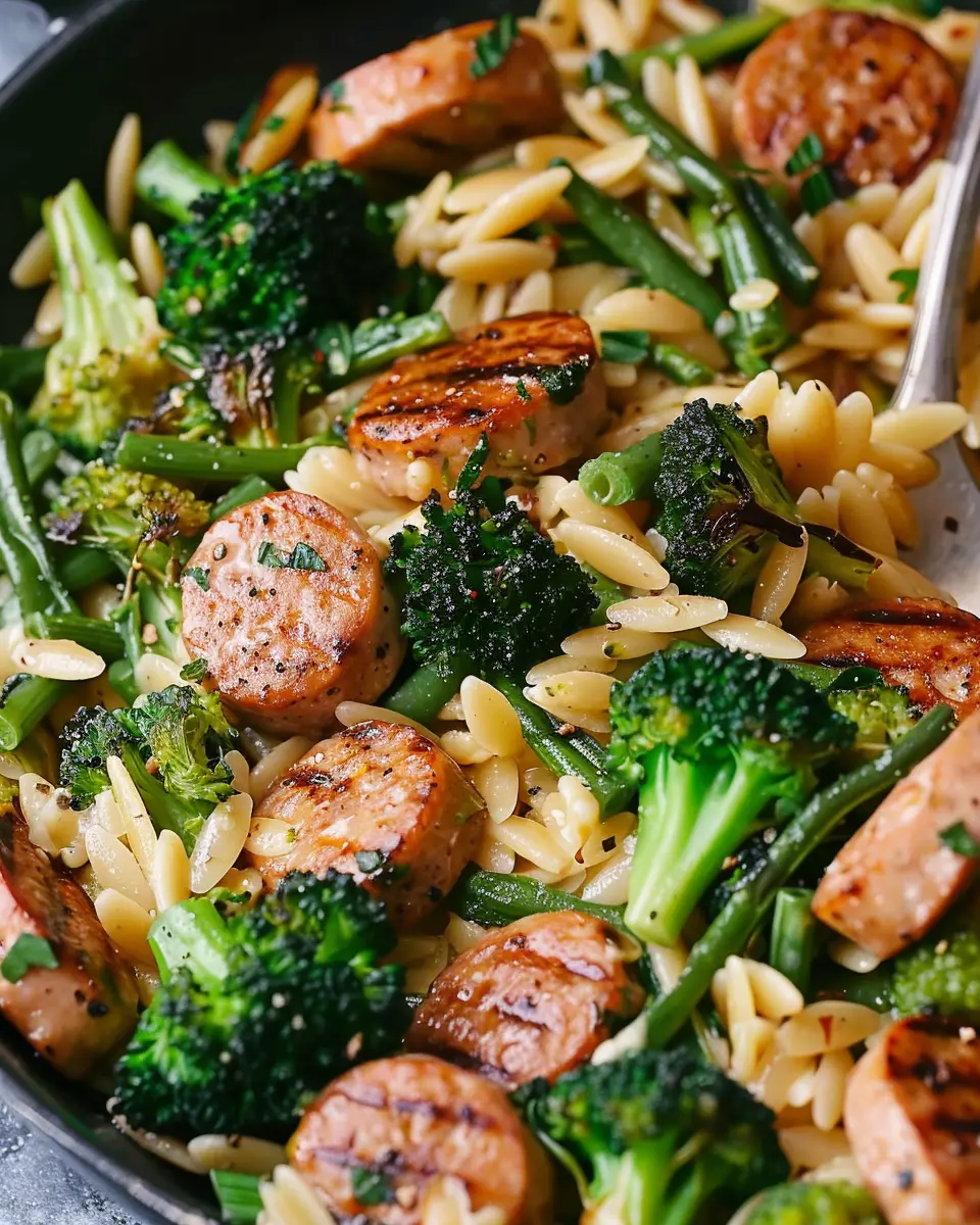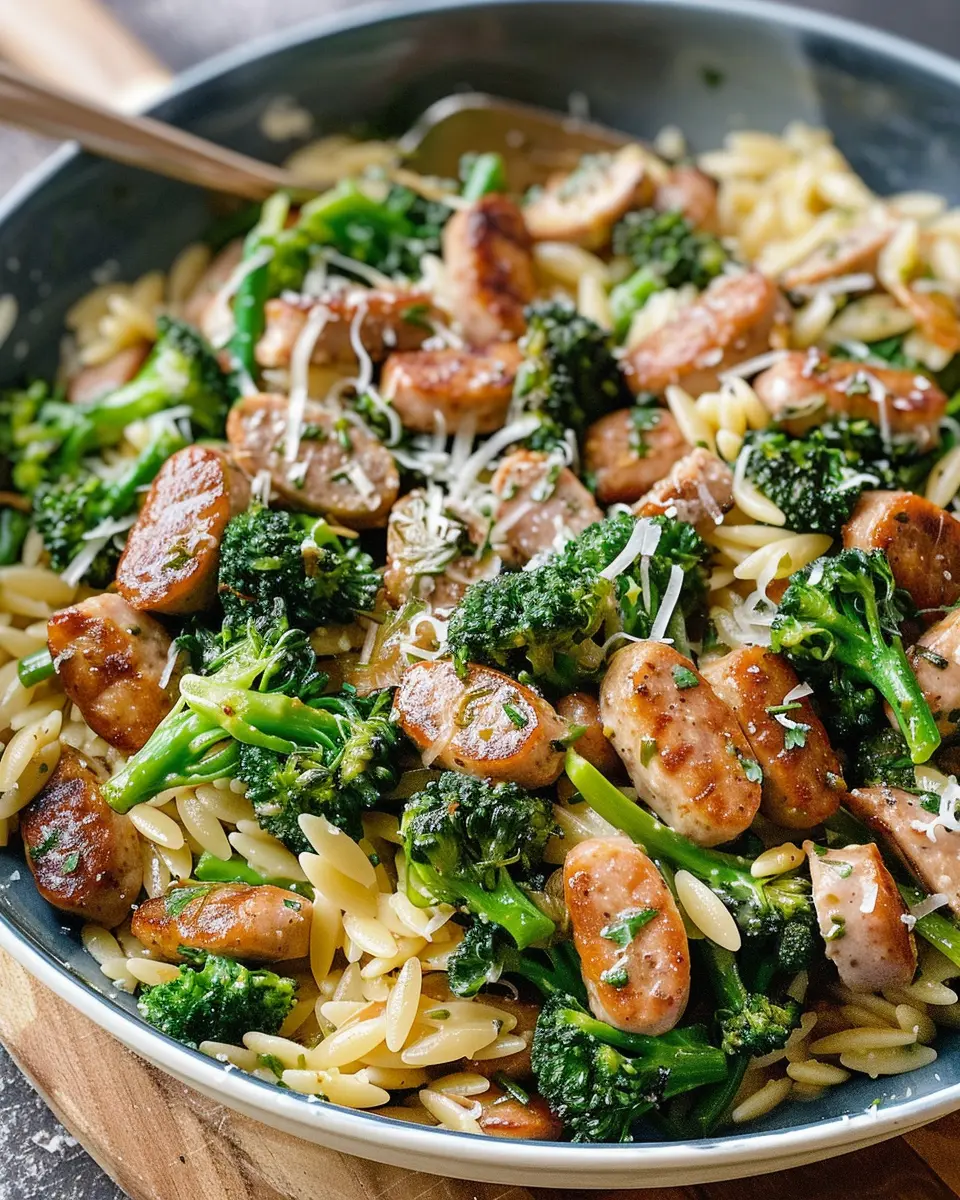 This dish combines the savory flavor of chicken sausage with nutritious broccoli and orzo pasta, making it a delightful meal perfect for any quick dinner.