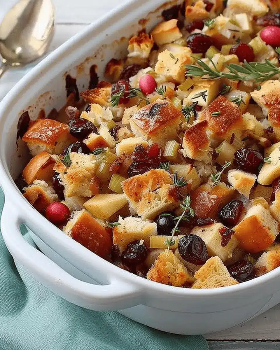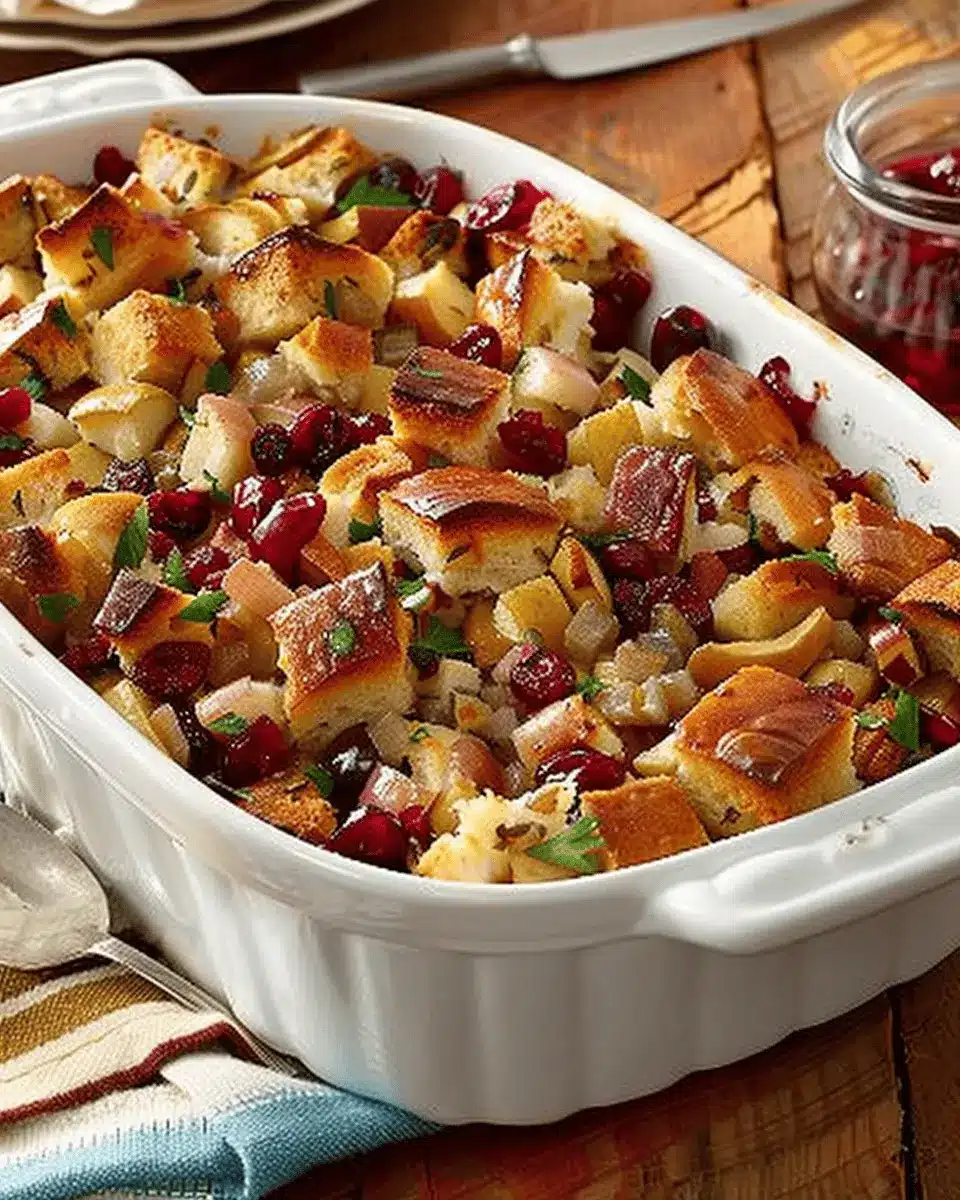 A delightful blend of cranberries and apples creates a comforting stuffing perfect for any meal.