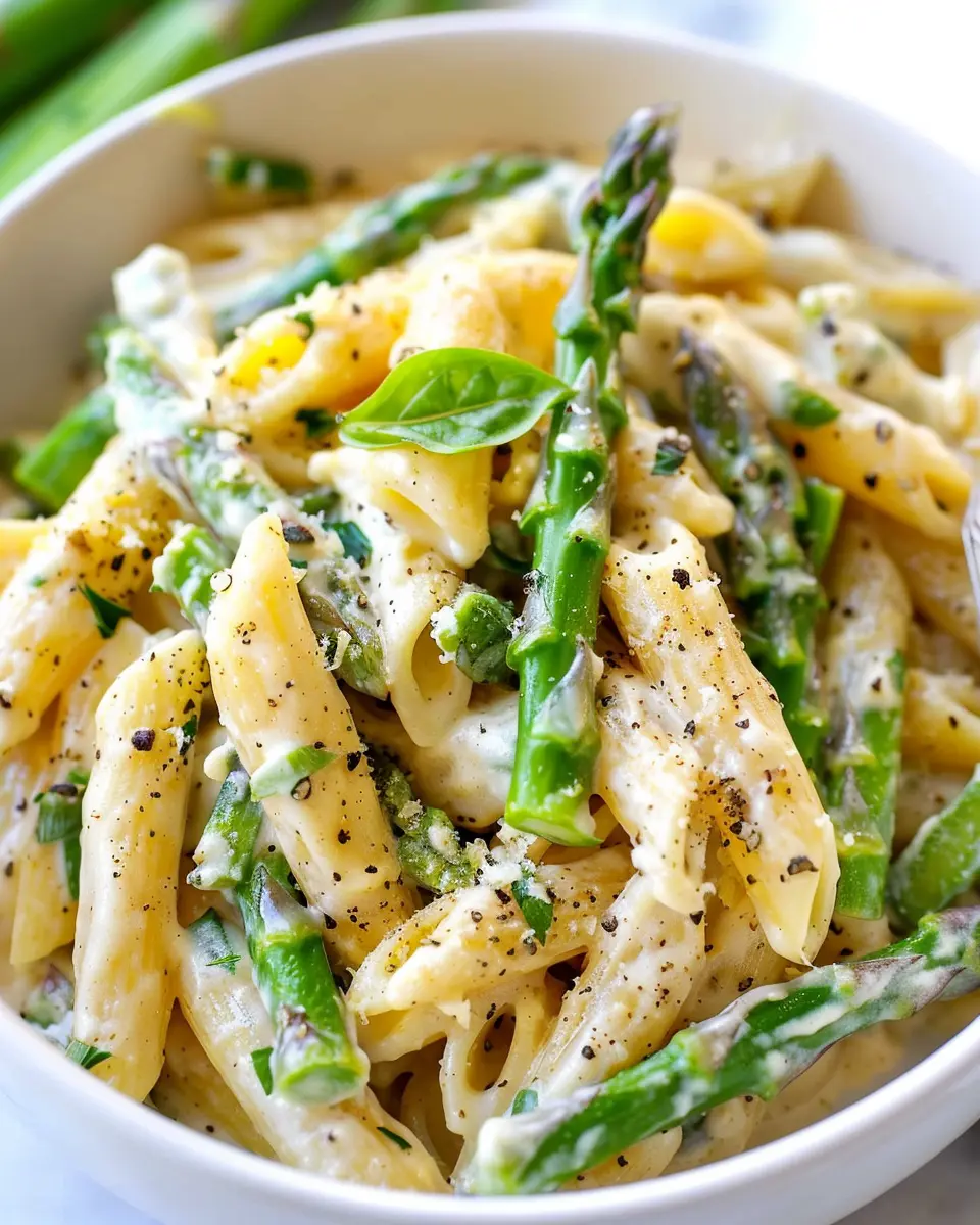 A delicious and creamy asparagus pasta dish featuring turkey bacon, perfect for comfort food lovers.