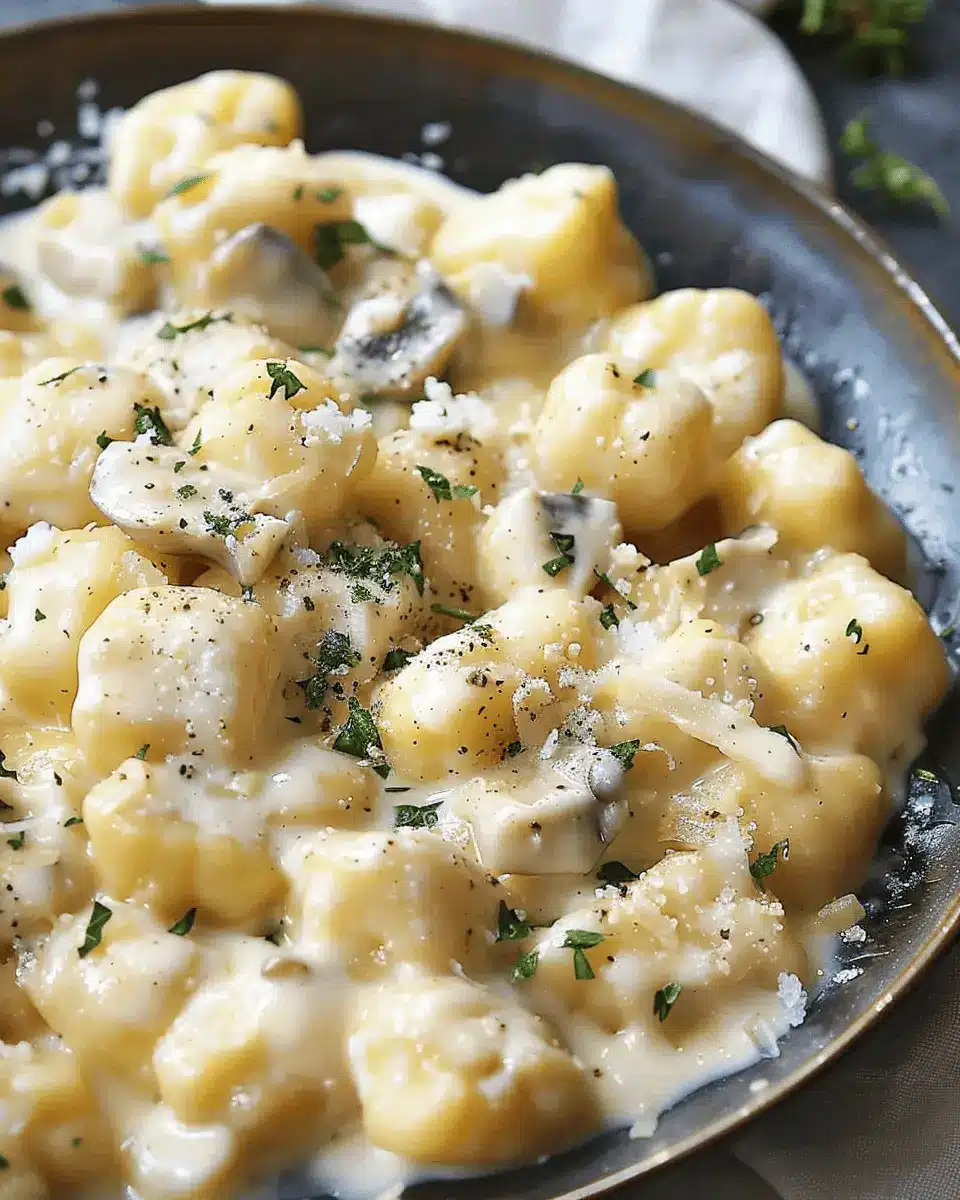 Once cooked, use a slotted spoon to transfer the gnocchi directly into your creamy mushroom sauce. Gently toss the two together over low heat for about a minute, allowing the flavors to meld.