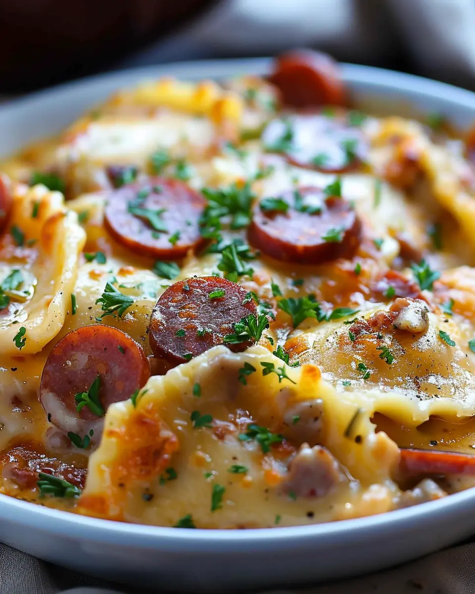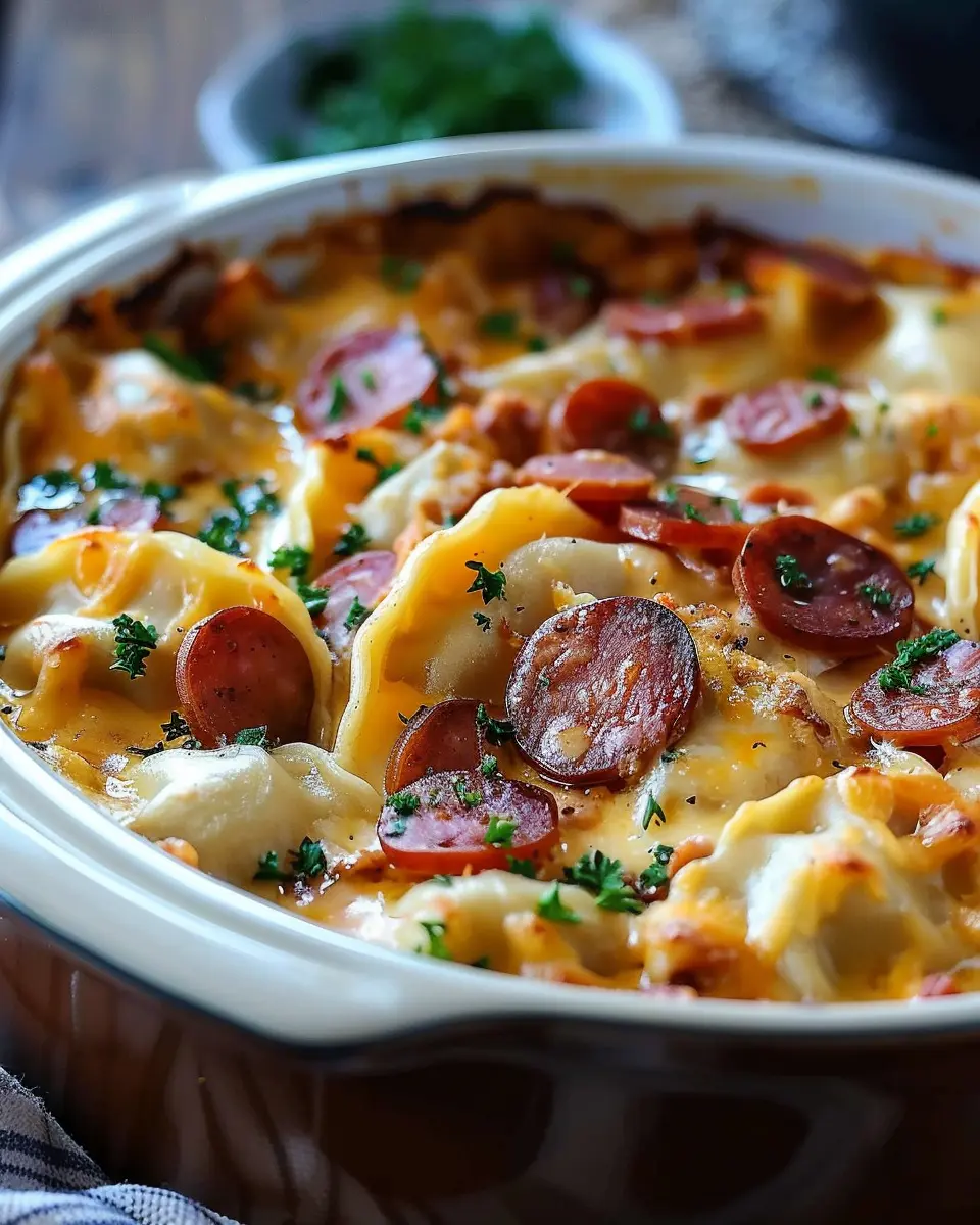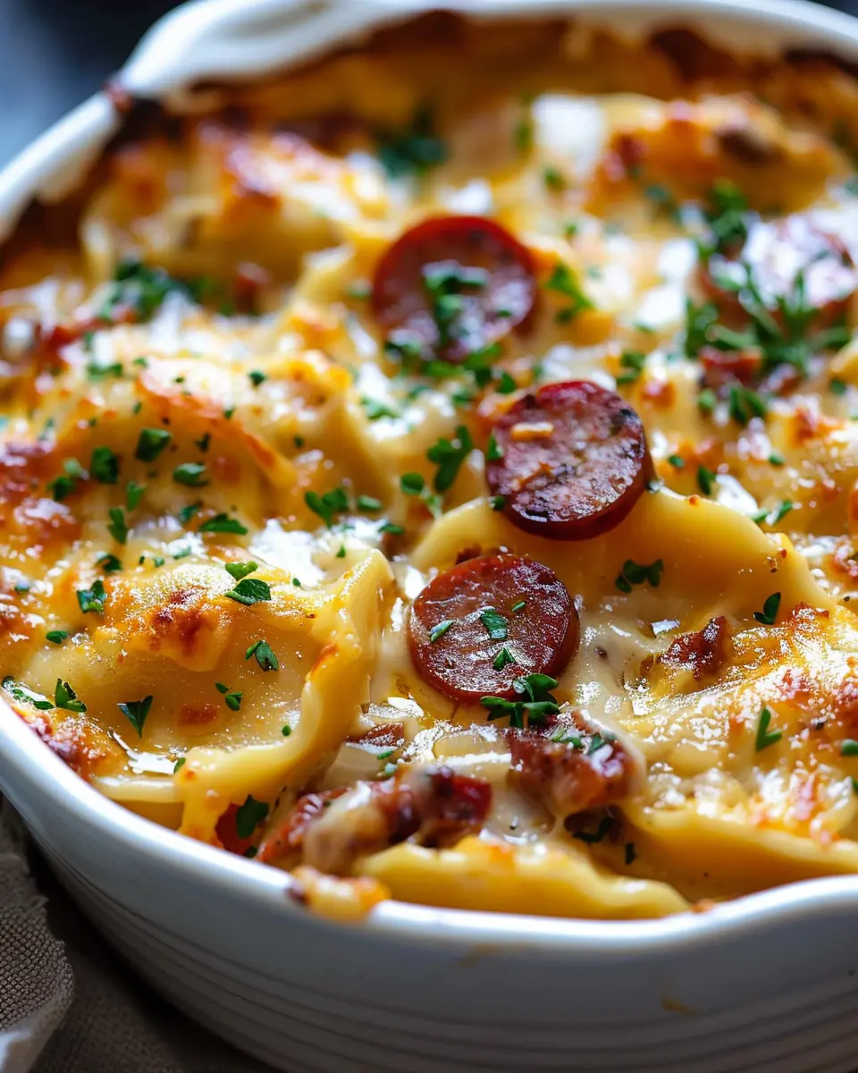 A comforting and delicious dish that combines the flavors of pierogi and kielbasa.