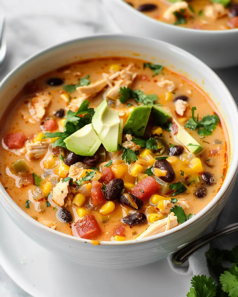 If creaminess is your thing, why not turn your easy chicken taco soup into a luxurious, creamy delight? Stir in some cream cheese or a splash of heavy cream right before serving, giving your soup an indulgent twist. Top it off with crunchy tortilla strips, diced avocado, and shredded cheese for the ultimate comfort food experience. This creamy chicken taco soup will become a cozy favorite in no time!