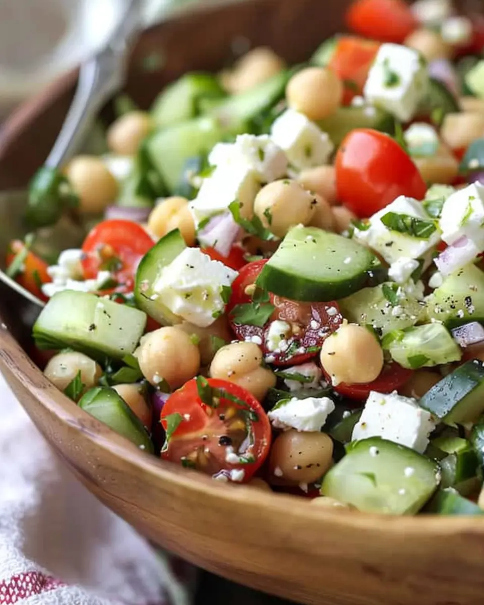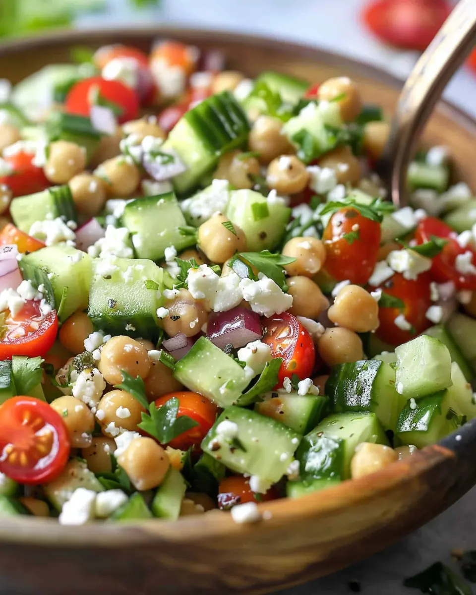 A refreshing and nutritious salad featuring chickpeas, crisp cucumber, and flavorful feta with tomatoes.