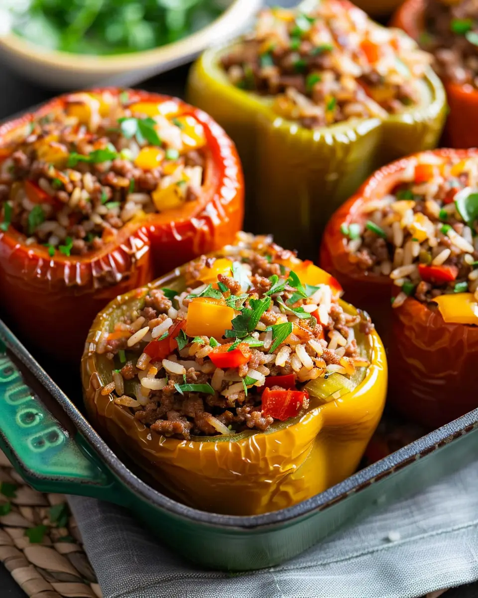 A delicious and easy recipe for stuffed bell peppers filled with ground beef and rice.