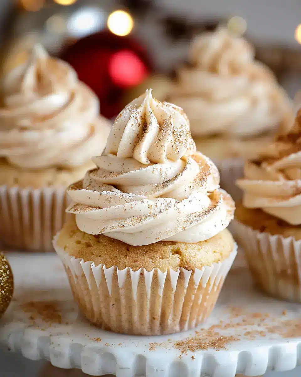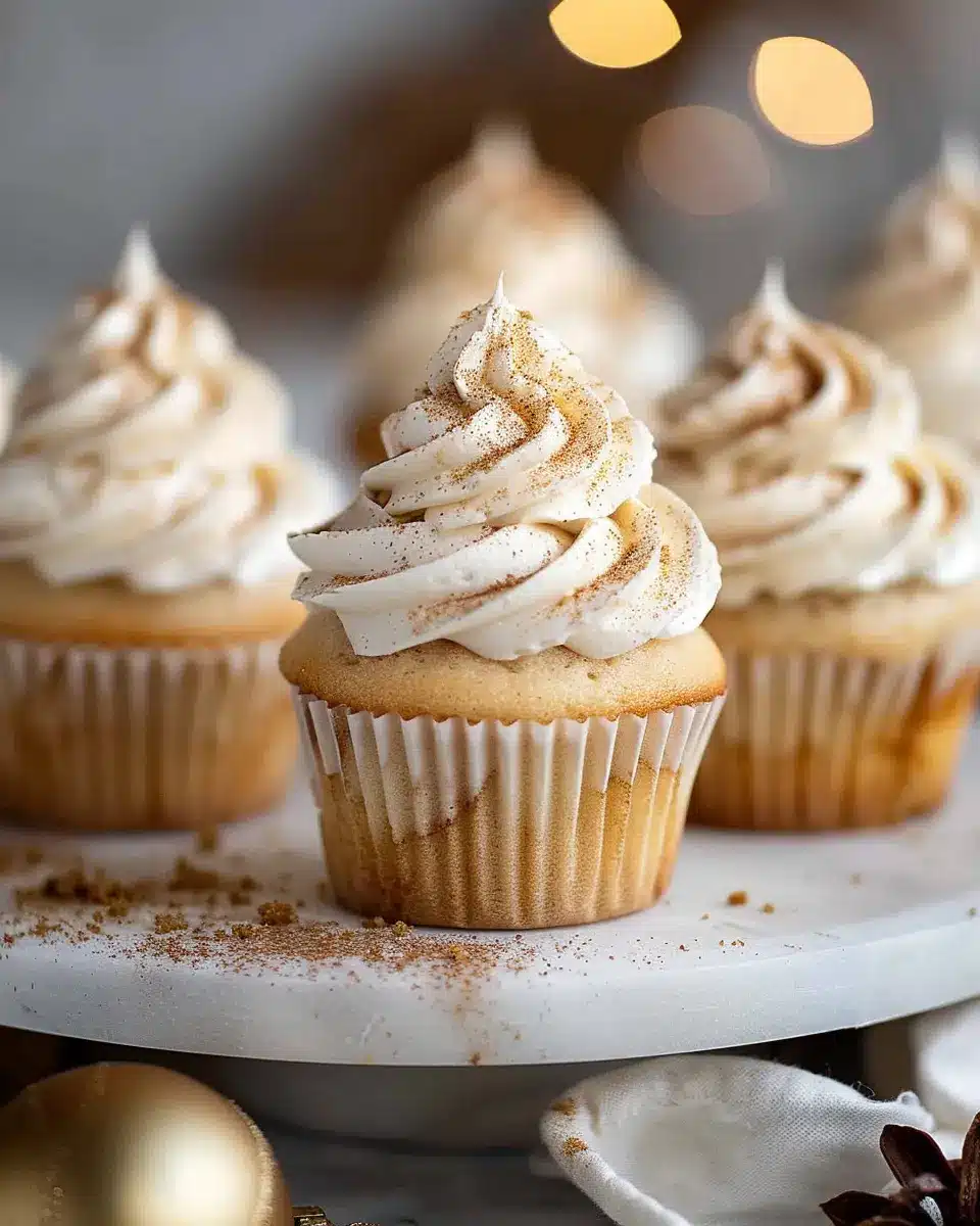 Indulge in the festive flavors of eggnog with these delightful cupcakes, perfect for the holiday season.