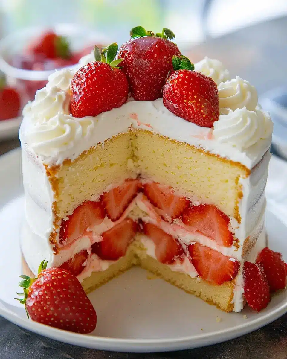 While your cake cools, whip 1 cup of heavy cream with some sugar (to taste) until you reach soft peaks. Prepare fresh strawberries by slicing them and tossing them with a bit of sugar to draw out their juices. This simple preparation enhances their natural sweetness.