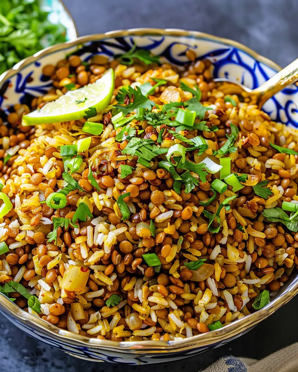 Caramelized onions are not just a garnish; they provide a rich sweetness that perfectly balances the earthy notes of the lentils and rice.