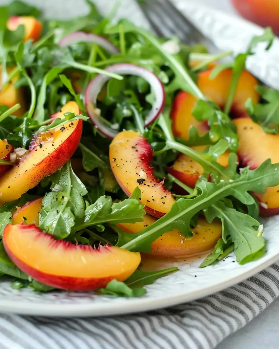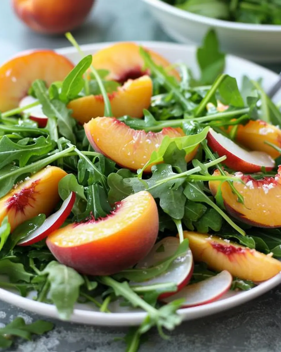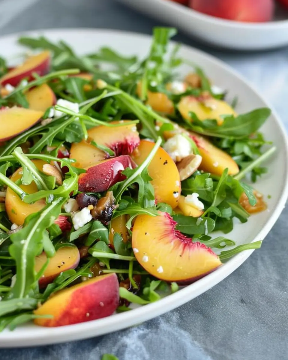 For a Mediterranean twist on your Peach and Arugula Salad, think sun-drenched flavors! Adding feta cheese provides a lovely salty contrast to the sweet peaches, while kalamata olives bring a briny punch that brightens the entire dish. You can also add some diced cucumber and cherry tomatoes for added freshness and crunch. A squeeze of lemon juice, combined with olive oil, makes for a zesty dressing that ties everything together beautifully.