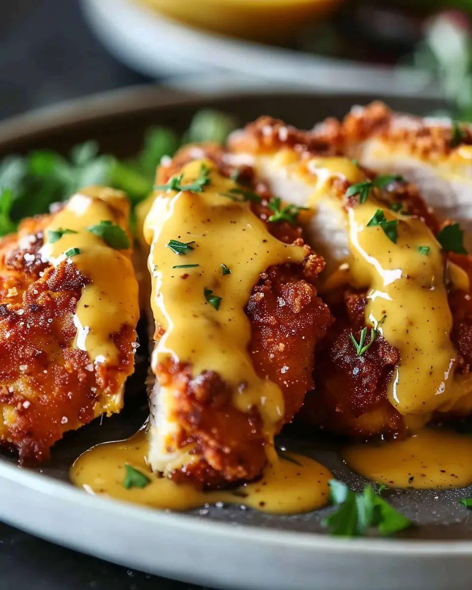 7. Serve the chicken hot, drizzled with the mustard-cheddar sauce.