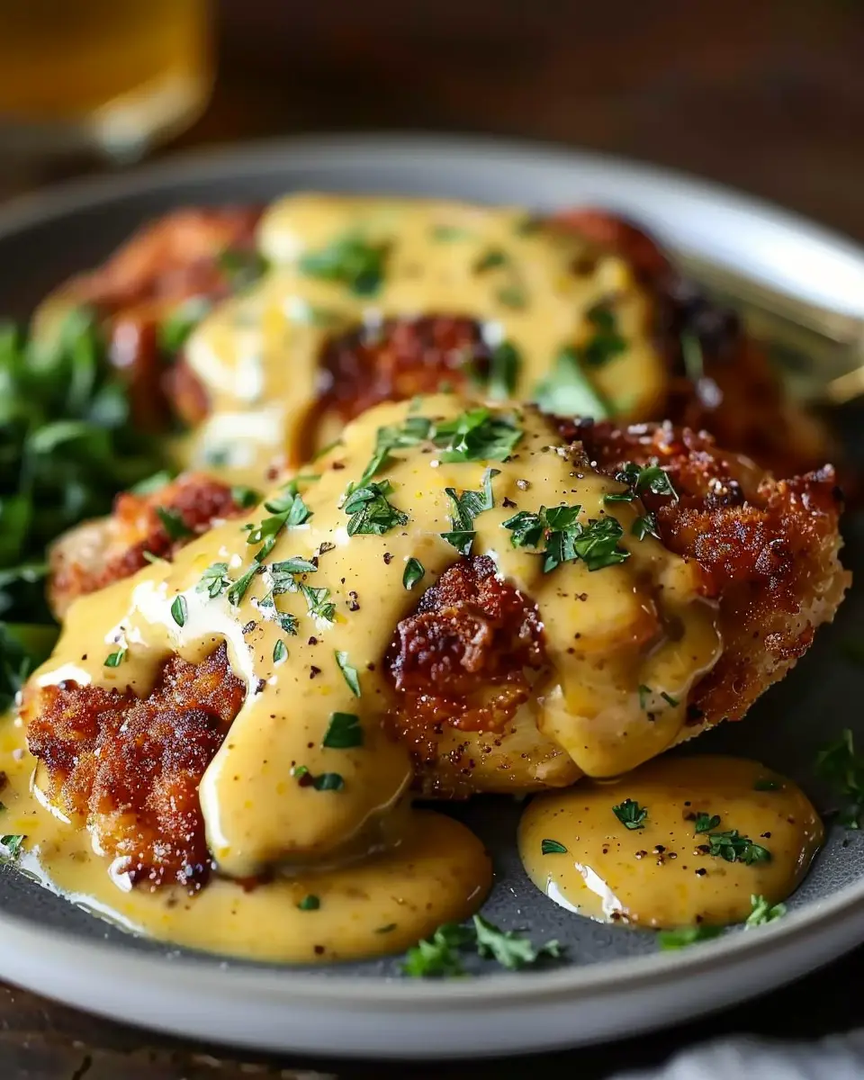 • Drizzle the mustard-cheddar sauce artistically around the chicken for a gourmet look.