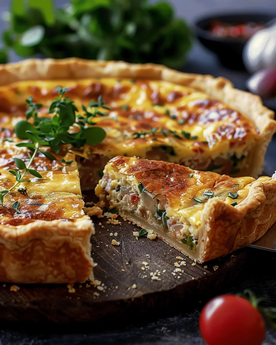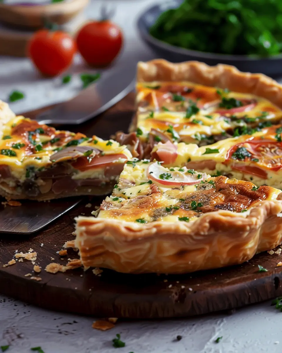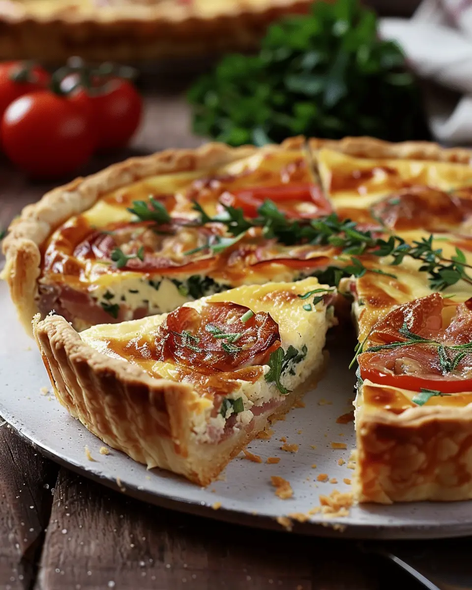 A delicious quiche recipe featuring turkey bacon and chicken ham, perfect for any meal.