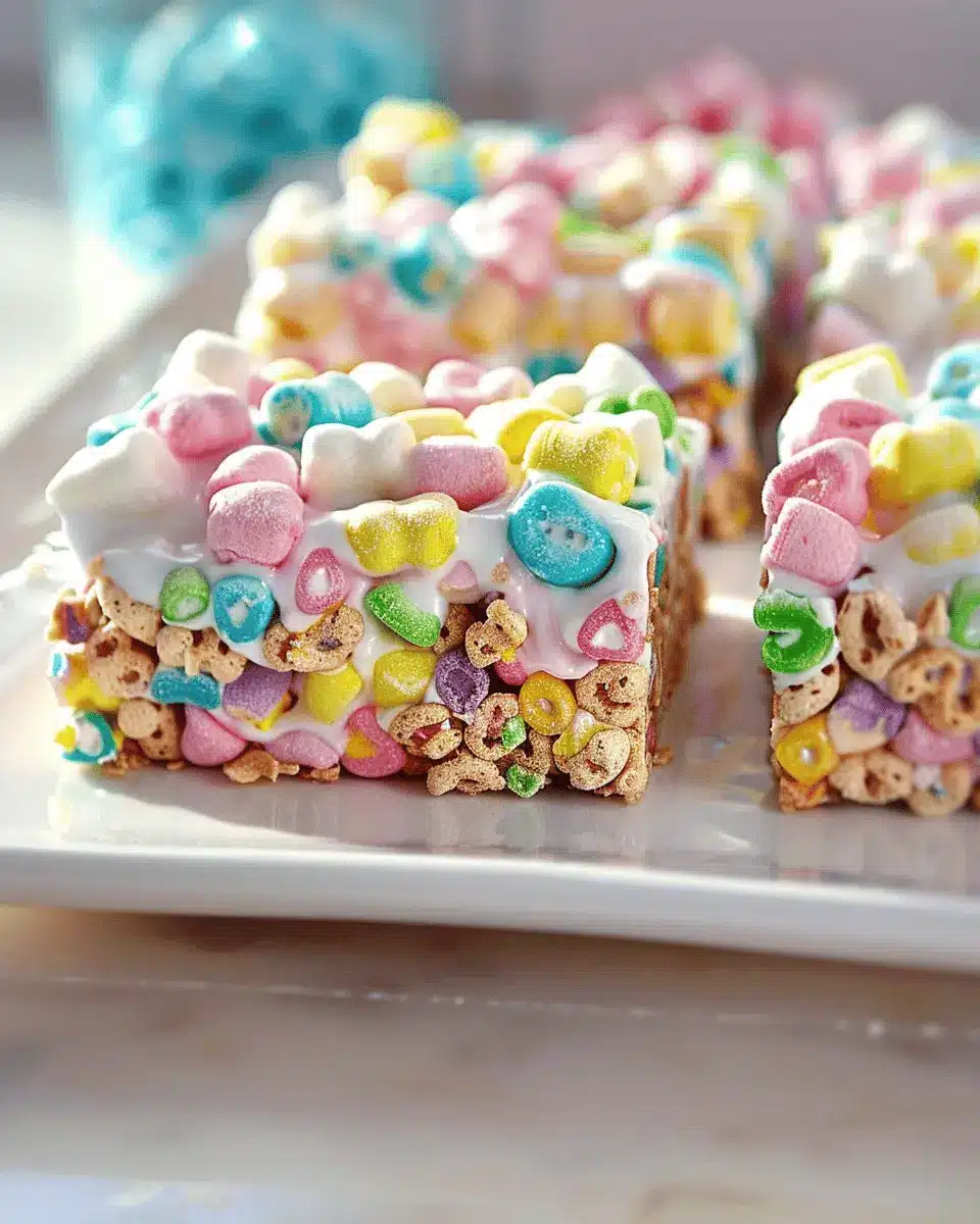 In total, you’ll invest around 1 hour and 15 minutes into crafting these colorful treats. Isn’t it wonderful how such a fun and delicious recipe can come together in such a short time? Ready to dive into the world of Lucky Charms magic? For more tips on creating delectable dessert bars, check out Food Network for inspiration.