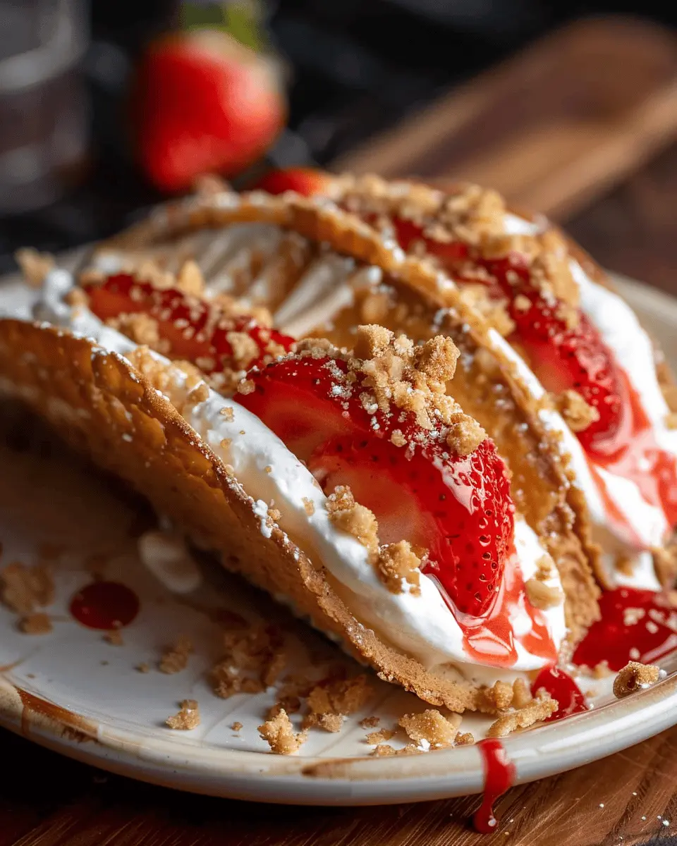 Don’t underestimate the power of visuals! Serve your Strawberry Crunch Cheesecake Tacos on a vibrant platter, garnished with fresh strawberries and mint leaves for a pop of color. It transforms a simple dessert into a feast for the eyes.