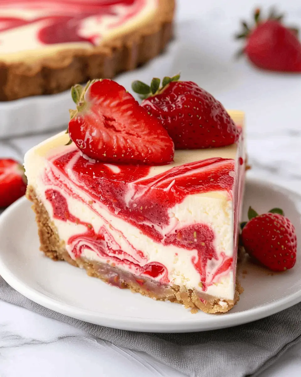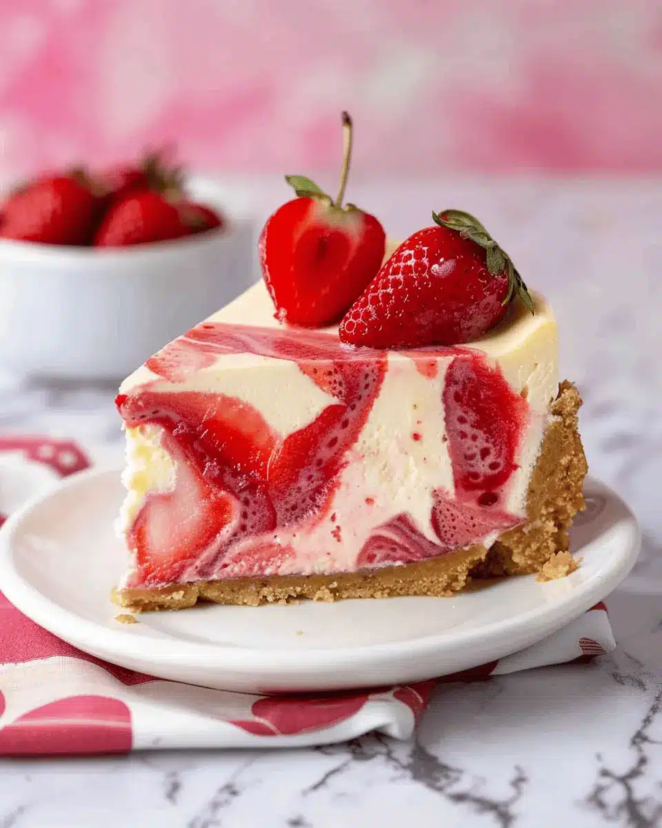 Visual Appeal: Let’s be real; we eat first with our eyes. The vibrant red strawberry swirls create an eye-catching contrast against the creamy cheesecake base, making it not just a dessert, but a centerpiece.