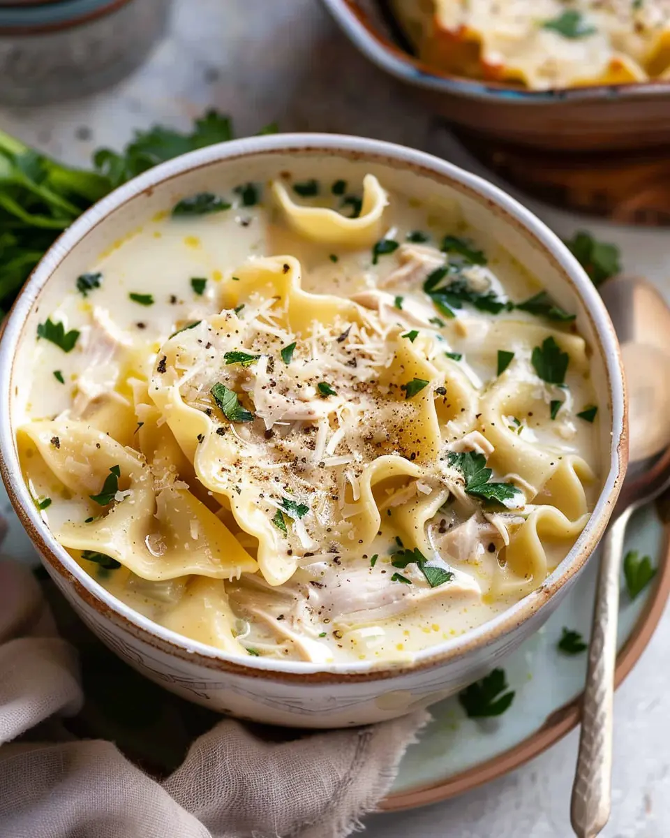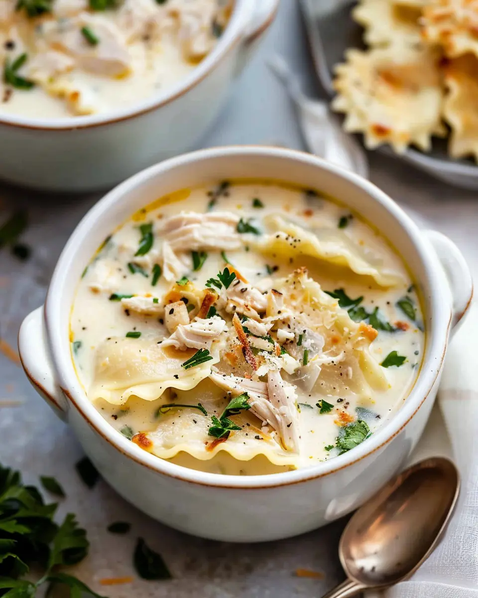 A comforting and easy-to-make soup that combines the flavors of lasagna with tender chicken.